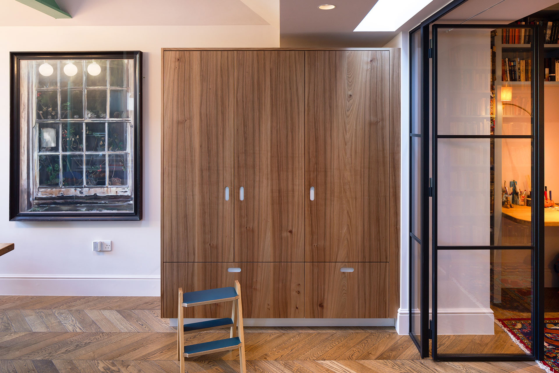 On the other side of the room, the blue of the cabinetry is picked up in the hue of the chairs at the table, the latter has the wonderful, worn patina of a piece that has seen many good times. Here we designed an Elm crockery cupboard and larder with Ruskin Blossom interior. The change in material keeps the continuity and zoning of the different areas of the kitchen cohesive, with the wood’s grain bringing a soft warmth and texture to this corner of the room.