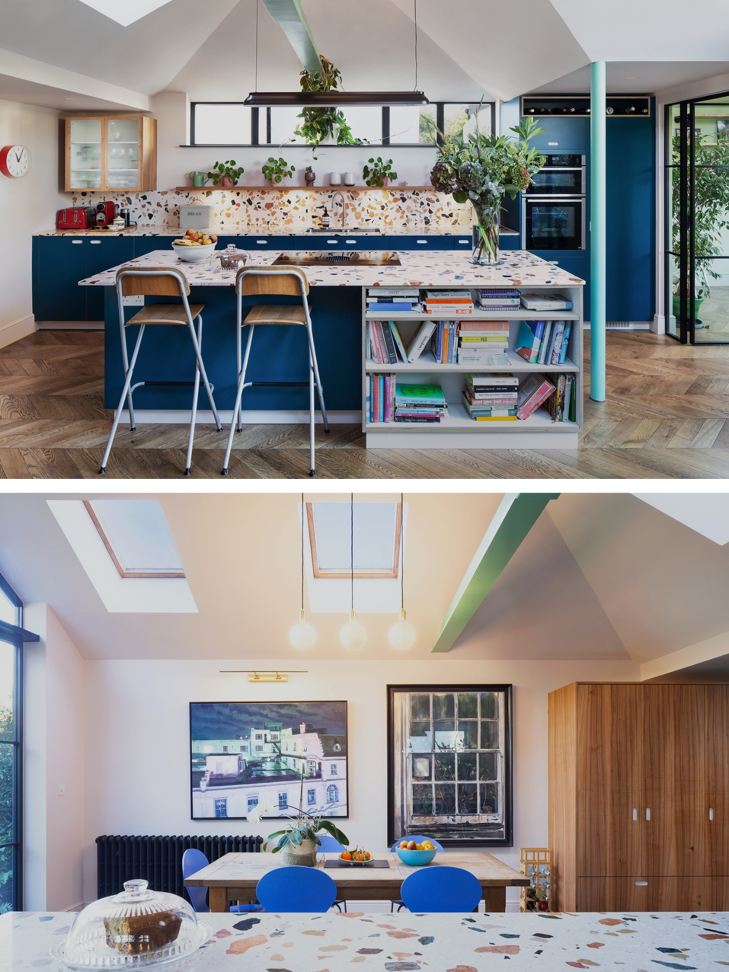 The cooking area of the kitchen is Atlantic Blue cabinetry with Half Moon White accents – the blue and white a classic combination. The focal point of this side of the room is the island which sits under the vaulted pitched ceiling. Yard Architects chose a punchy colour for the support structures of this dramatic roof and the circular column and beam are painted Farrow & Ball’s Arsenic green, a joyful celebration of the room’s structure.