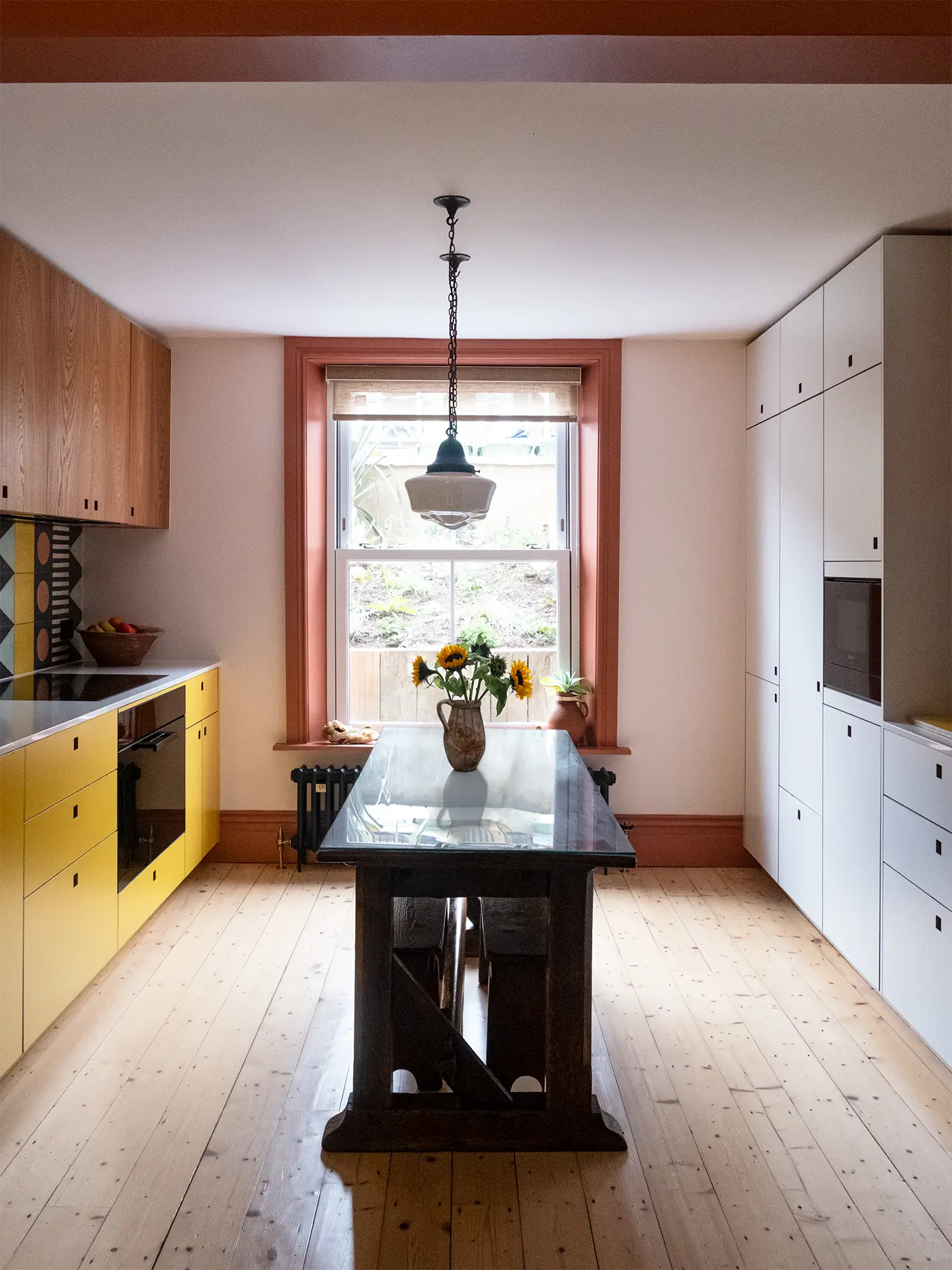 This room is located on the lower ground floor of the early Victorian terrace, so making the most of natural light is important. The sill of the large sash window is an unusually low height – undoubtedly a bonus, but means cupboards in front would block it. Thus a galley layout, with cabinetry on either side, is the logical configuration. The window is also a lovely focal point for the room. The clay coloured architrave (Red Earth by Farrow & Ball) doing even more to draw the eye and frame the garden greens.
