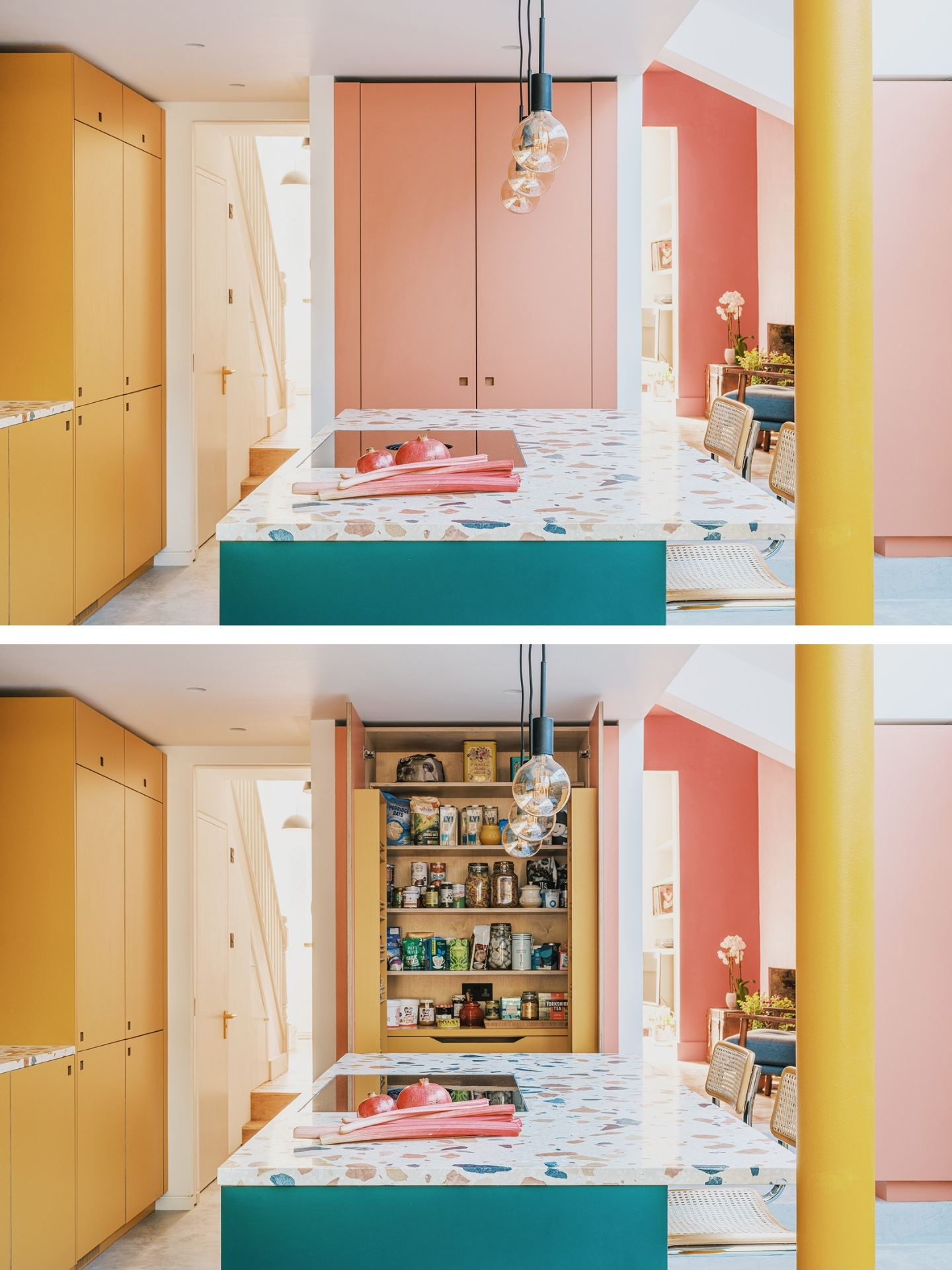 From the forest green frames of the windows and upholstery on the banquette, to the mustard yellow structural column and marble terrazzo Marmoreal® worktop by Dzek, the Pluck hues are colour matched throughout the space to create a cohesive palette. The living room is colour matched to Ritzy’s coral pink, so this warm shade frames the room as you approach from here.
