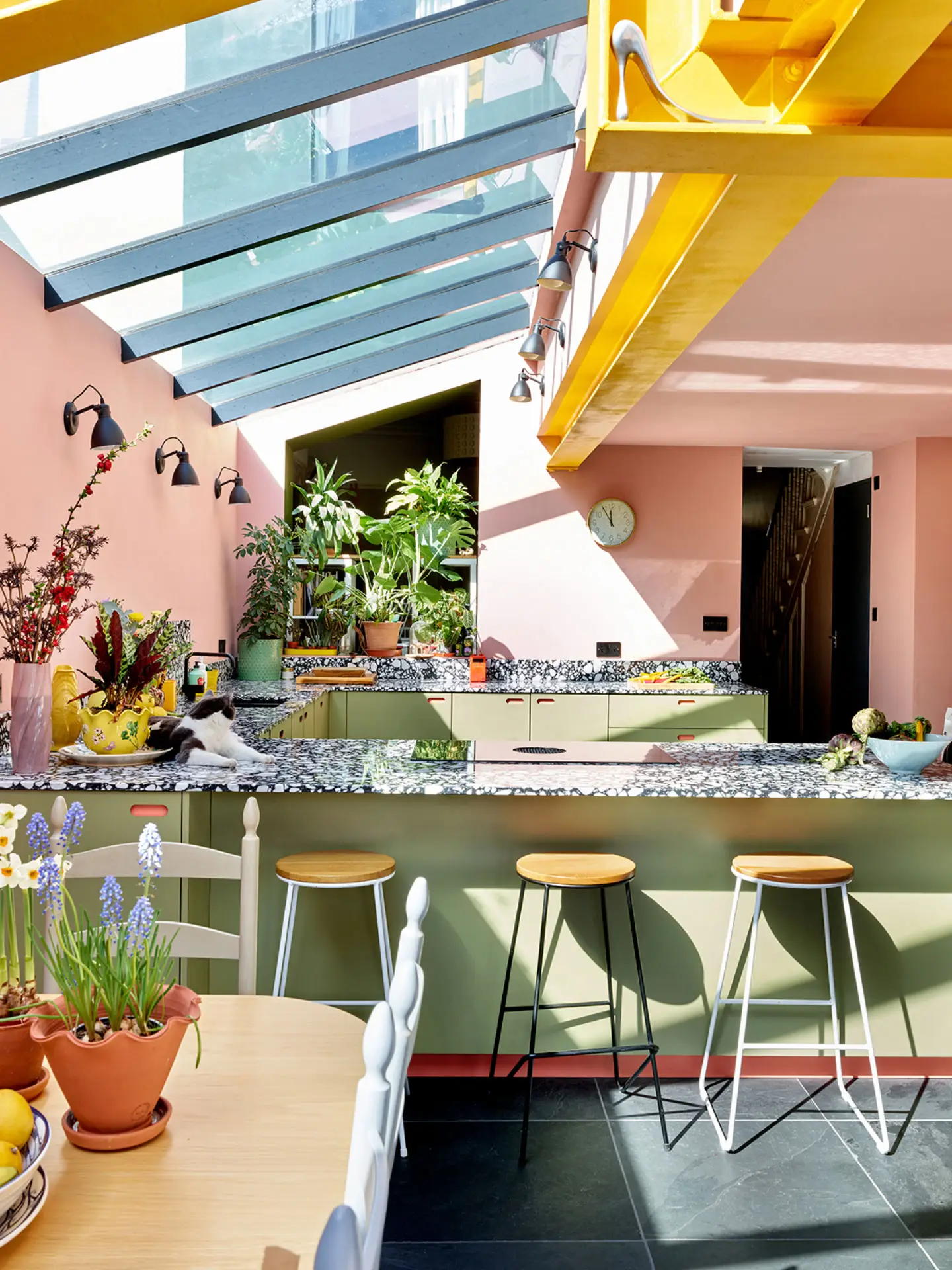‘I’d been dreaming about this kitchen for two decades’ explained our client to Ideal Home and now ‘it just makes me feel happy’. To create this light filled, colour-suffused room a new extension with glorious garden views replaced what had been a long galley kitchen.