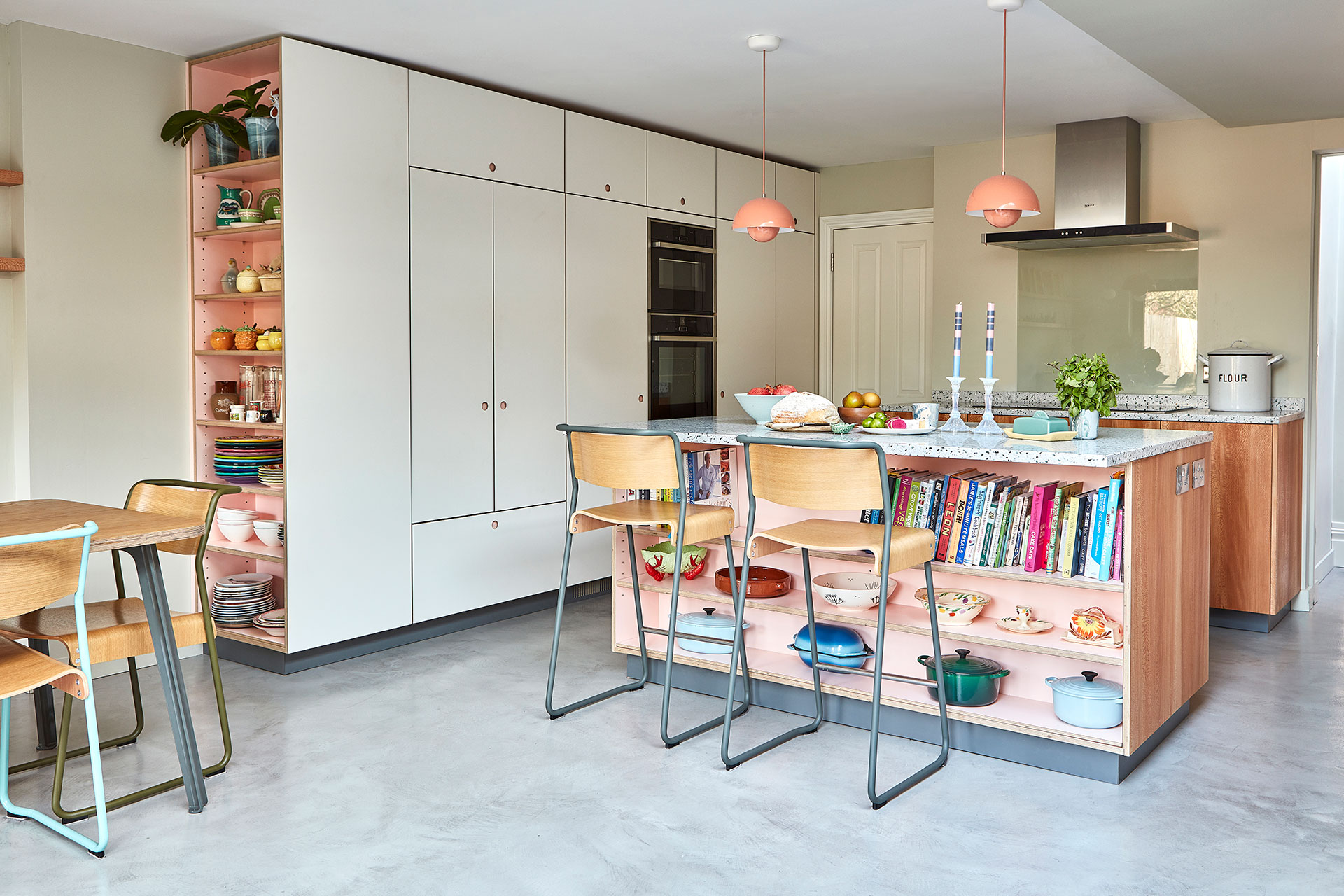Set in a Victorian semi in Dulwich, South East London this kitchen is an oasis of soft and subtle colours. The cabinets are London Plane and Half Moon White, topped with Diespeker and Co terrazzo, whilst Ruskin Blossom is used playfully in the larder and open shelf interiors. Architects Campbell Cadey designed an extension which transformed the room from a long, poorly laid out galley kitchen to a larger, practical space that feels closely connected with the garden.