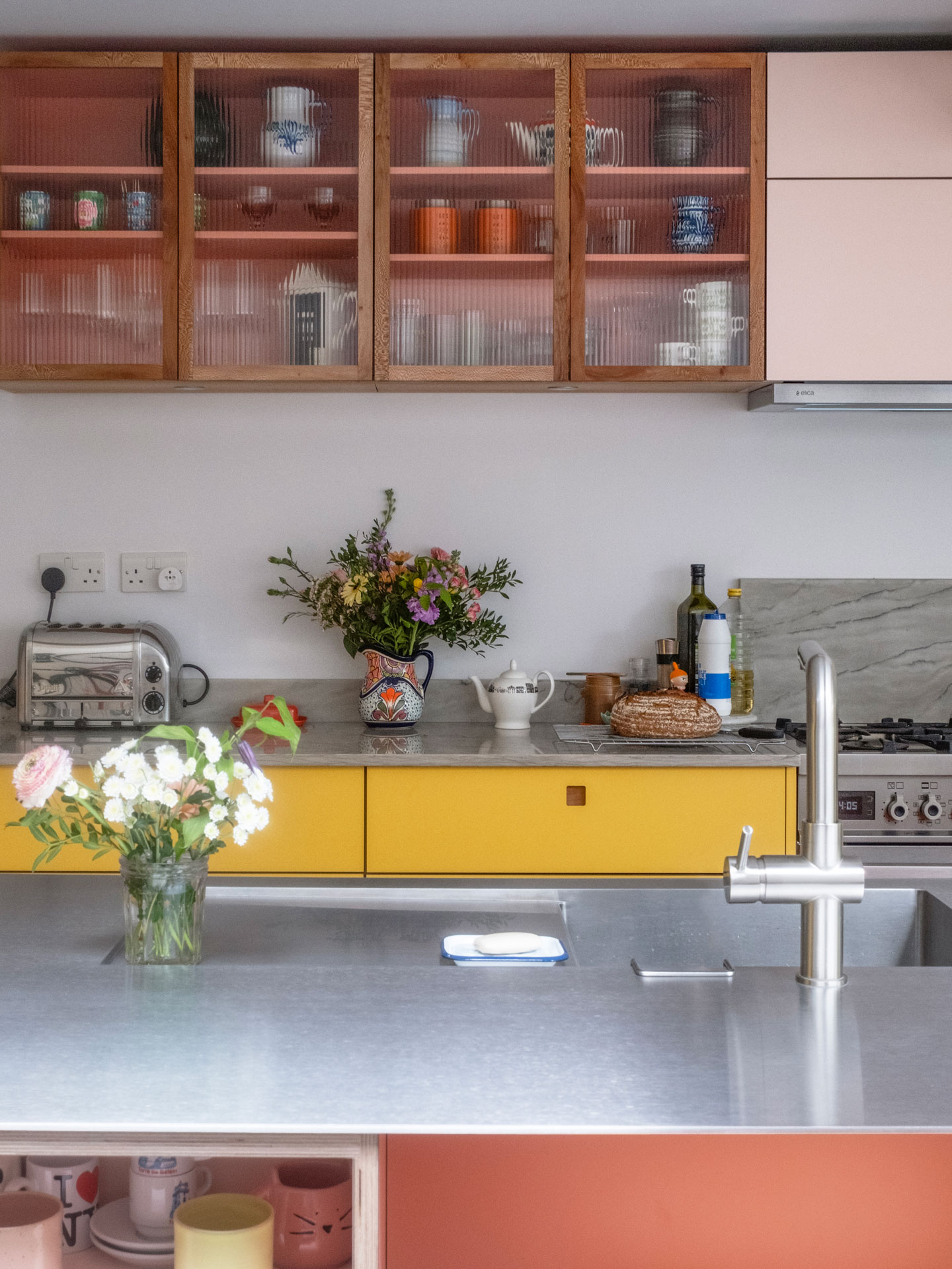 Our design includes three colours – Hollingbourne Yellow with two pinks – Ritzy and Ruskin Blossom. We were delighted to hear our clients particularly enjoyed choosing the colours with our design team. The wood is London Plane with its beautiful speckled grain.