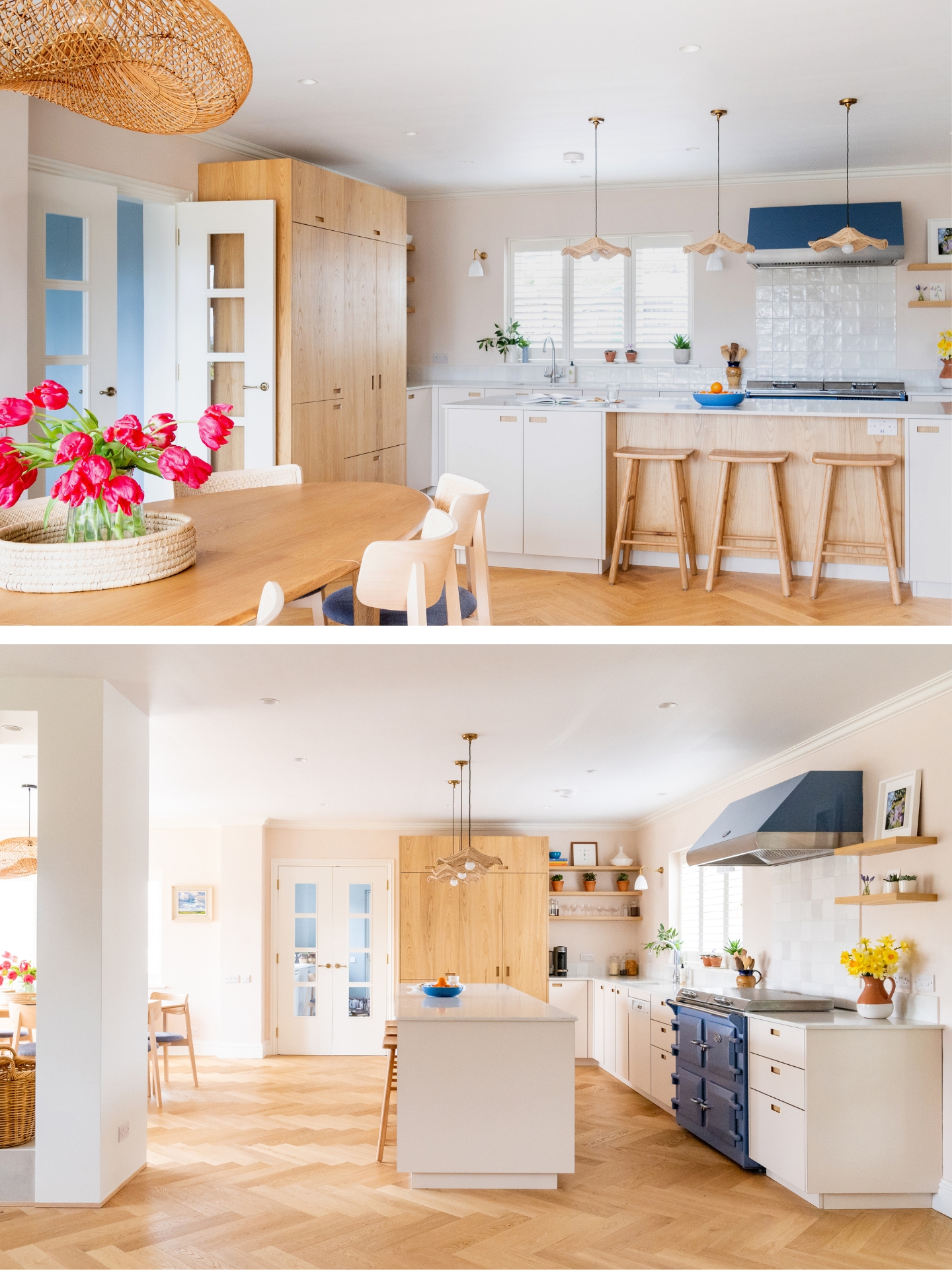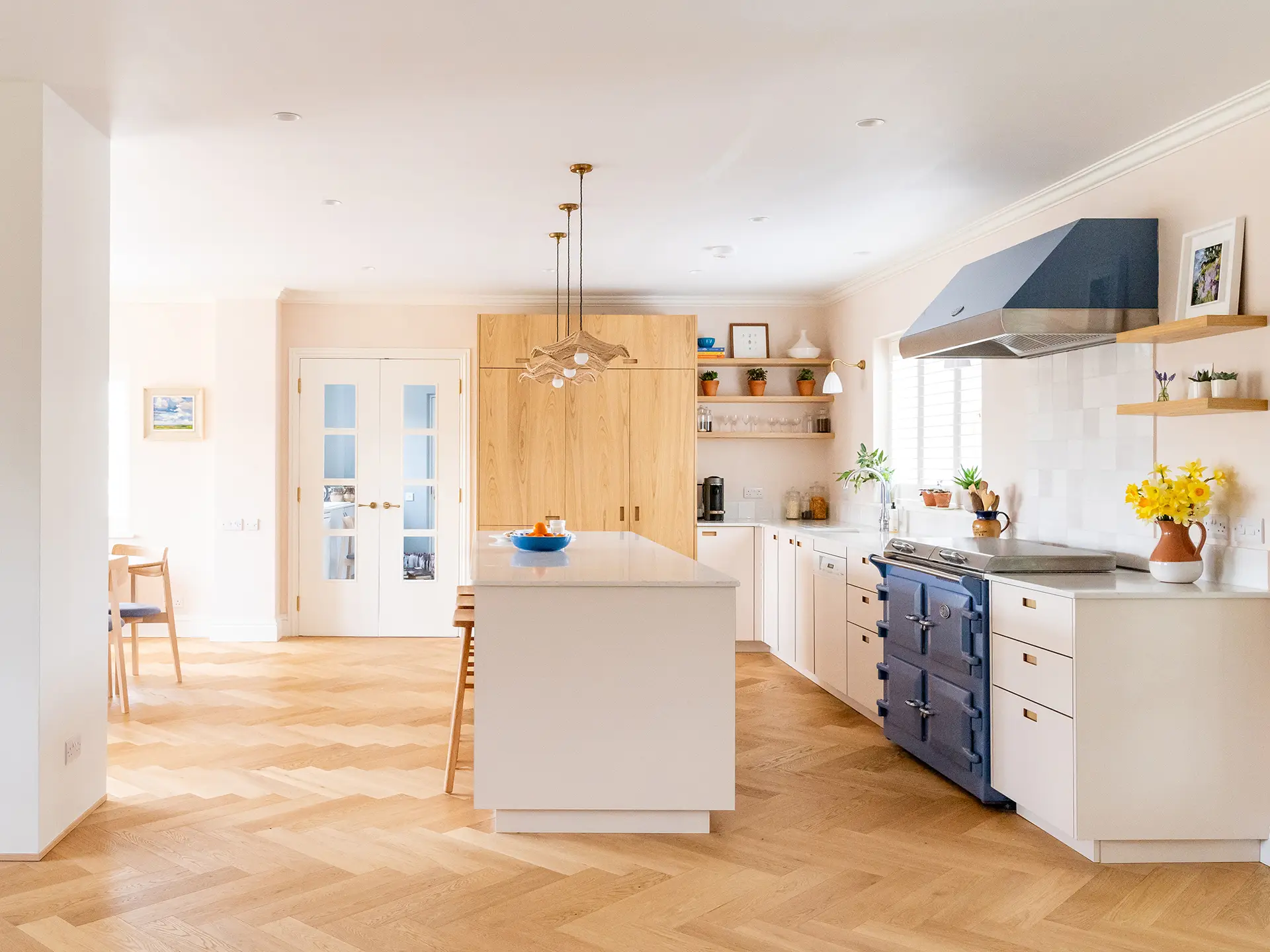 The neutral palette includes woods and soft beiges, with Pluck’s cashmere-like hue Eccles paired with Sweet Chestnut wood. Glossy white zellige tiles with their organic, uneven surface reflect light. The blue Everhot range cooker and matching hood is a statement, our clients enjoy cooking and they chose colourful kit of the best quality to rejoice in that.