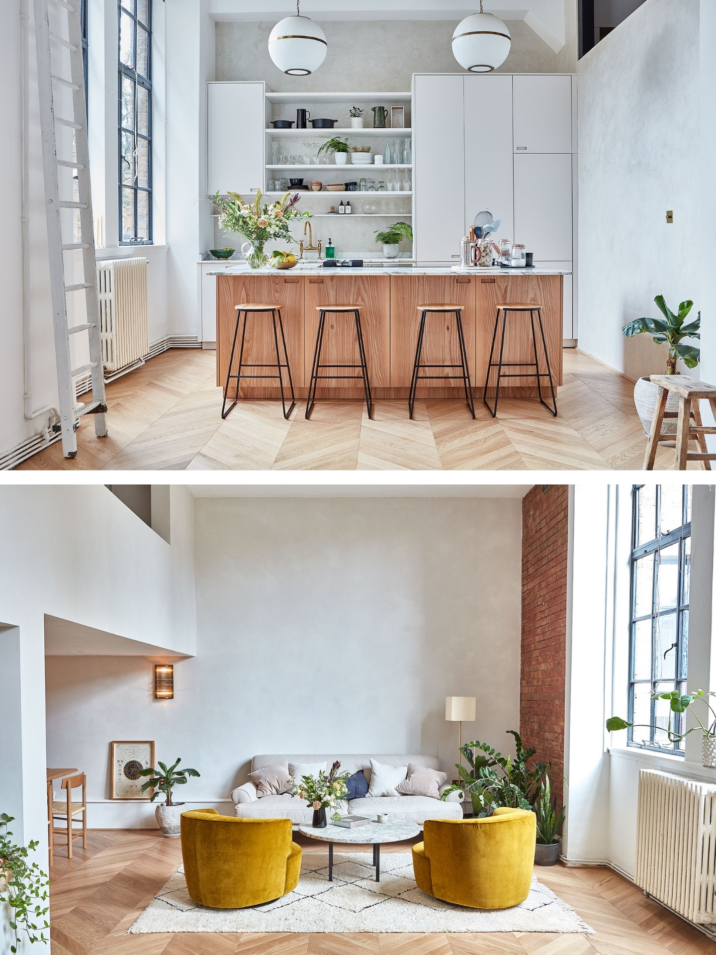 Set in a converted Victorian school house in East London, our kitchen design includes an extra tall larder and a large kitchen island with Elm veneers. These we hand arranged to enhance the beautiful grain. Our client sourced a marble worktop which complements the Elm’s stunning grain and added texture with Venetian plaster walls.