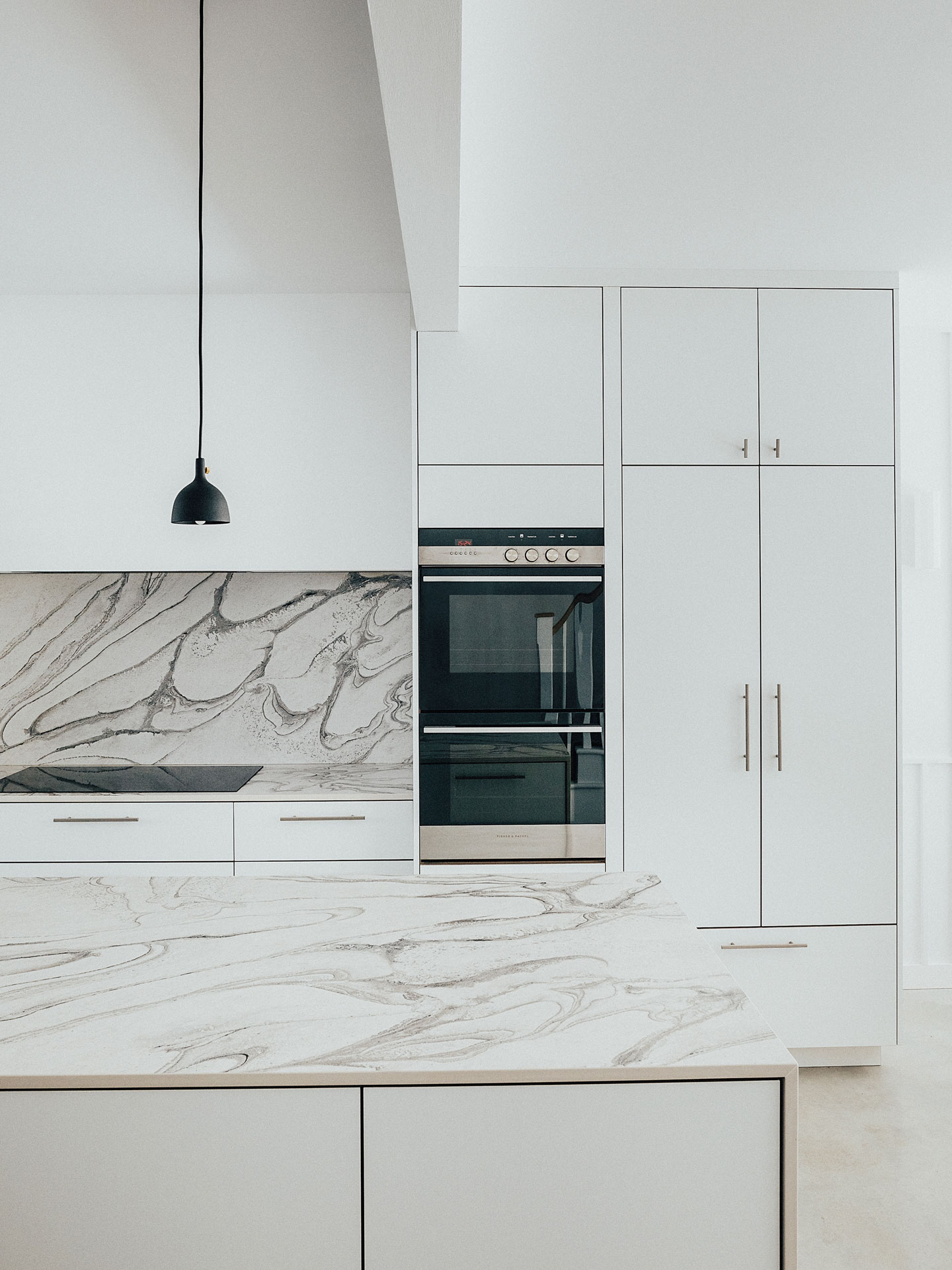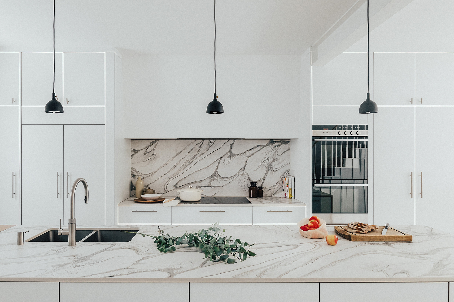 At the centre of the space is a Half Moon White Pluck kitchen. Our design includes symmetrical cupboards that nestle seamlessly with the room’s interior architecture, complementing the clean, minimalist lines.