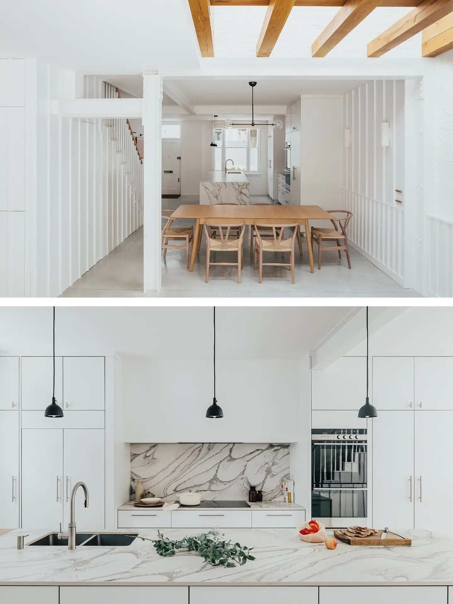 Amidst the serene whites of this room, wood including exposed structural oak beams, the dining table and chairs add warmth and texture. The floor is polished concrete.