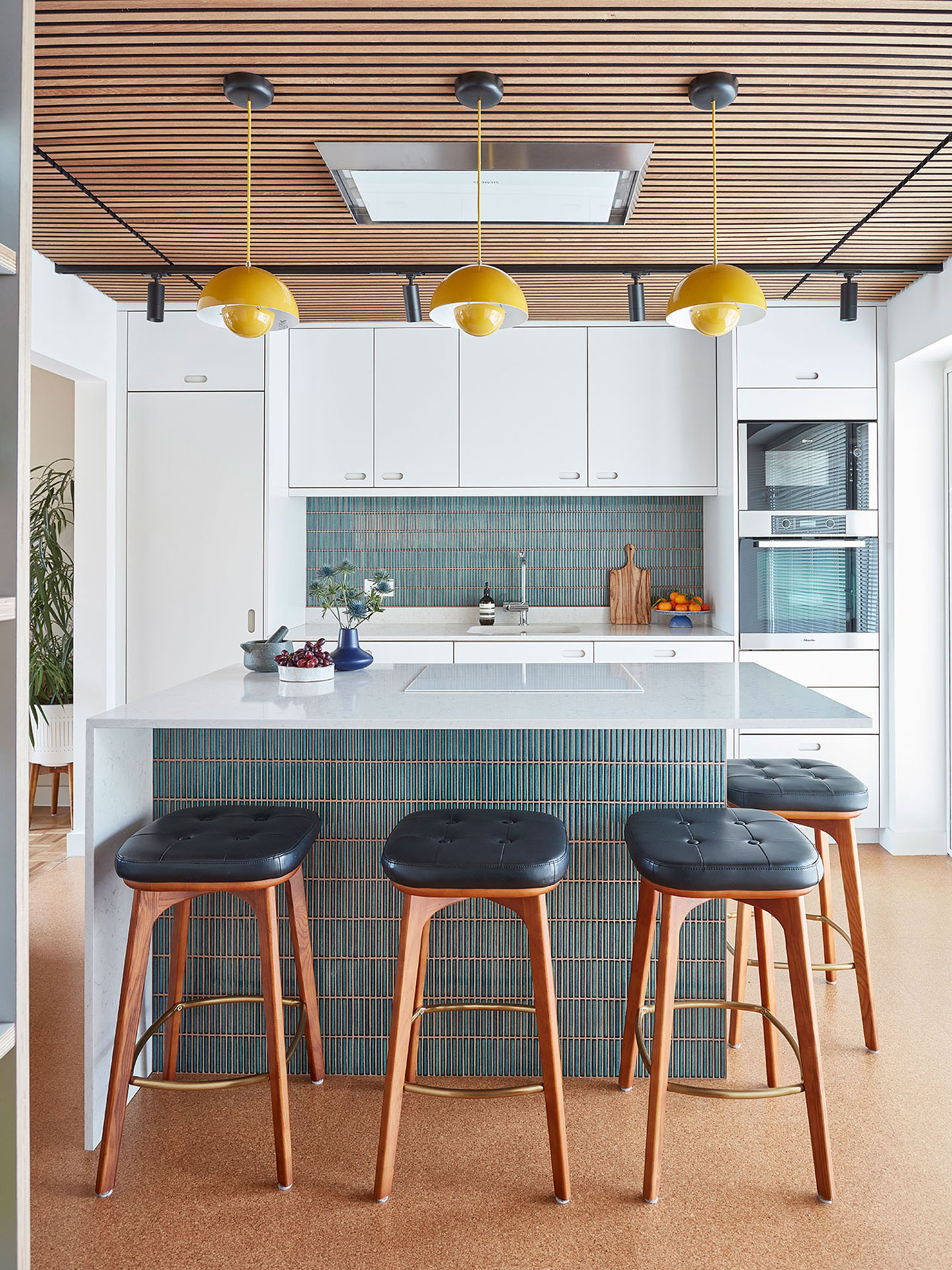 The kitchen is a long and rectangular space and with visual tricks, such as timber battening on the ceiling and vertical tiles on the island and splashback, Katharine’s clever design creates the impression of a wider room. A white induction hob on the island blends into the Silestone worktop, making this plain of surface seem larger too.