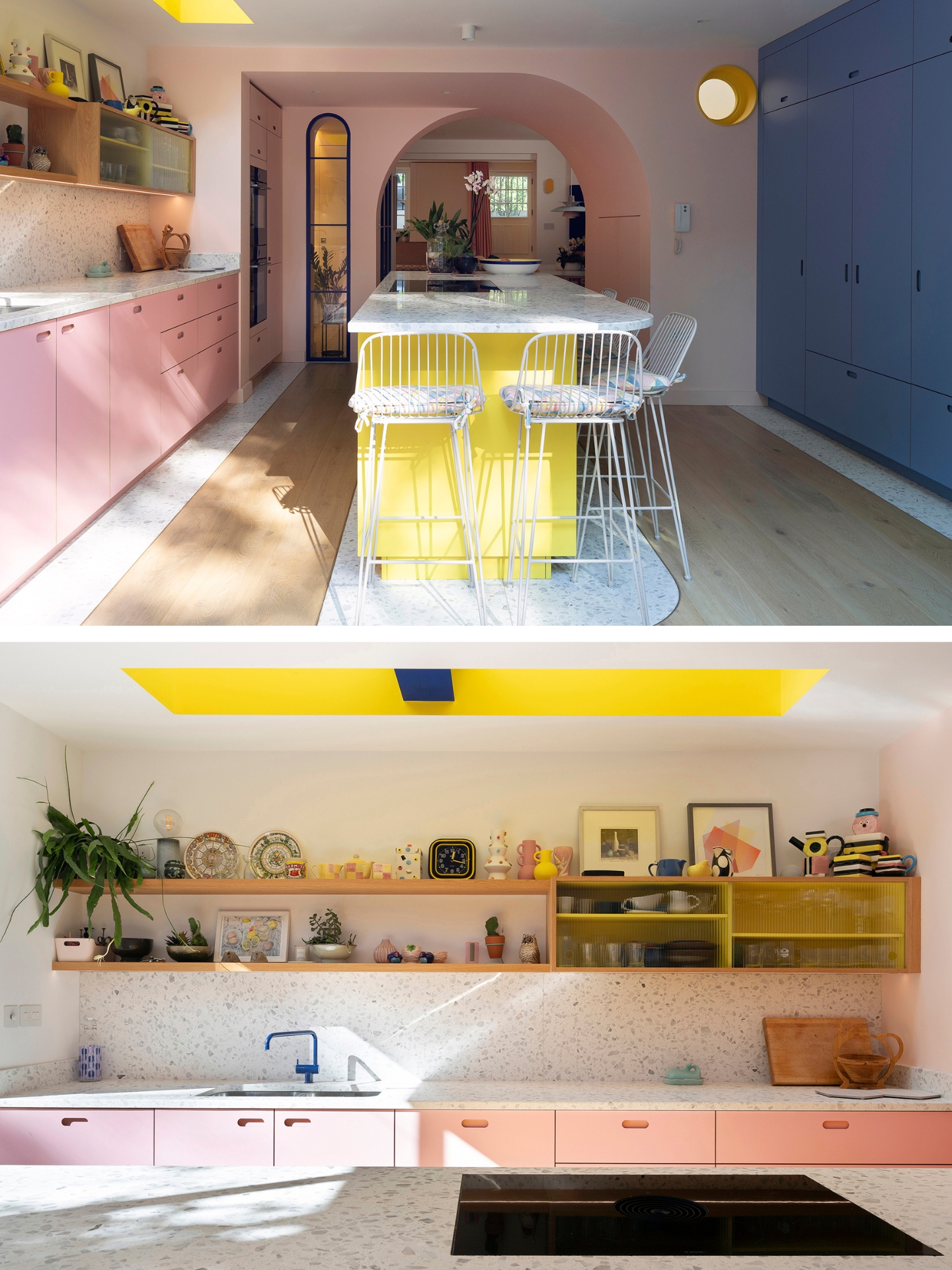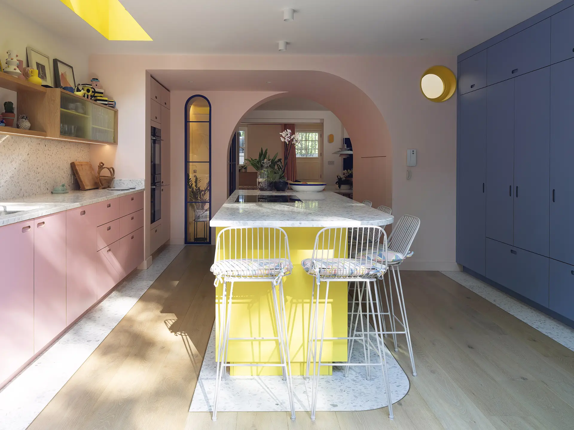 Our design includes a bespoke acid yellow island, a wall of Milton Blue – a chalky sky blue – cupboards and opposite the soft pink of Ruskin Blossom. Once the Pluck colours were established the palette for the rest of the room was decided, with pale pink walls, ultramarine blue for the glazing and tap (!) along with pops of yellow.