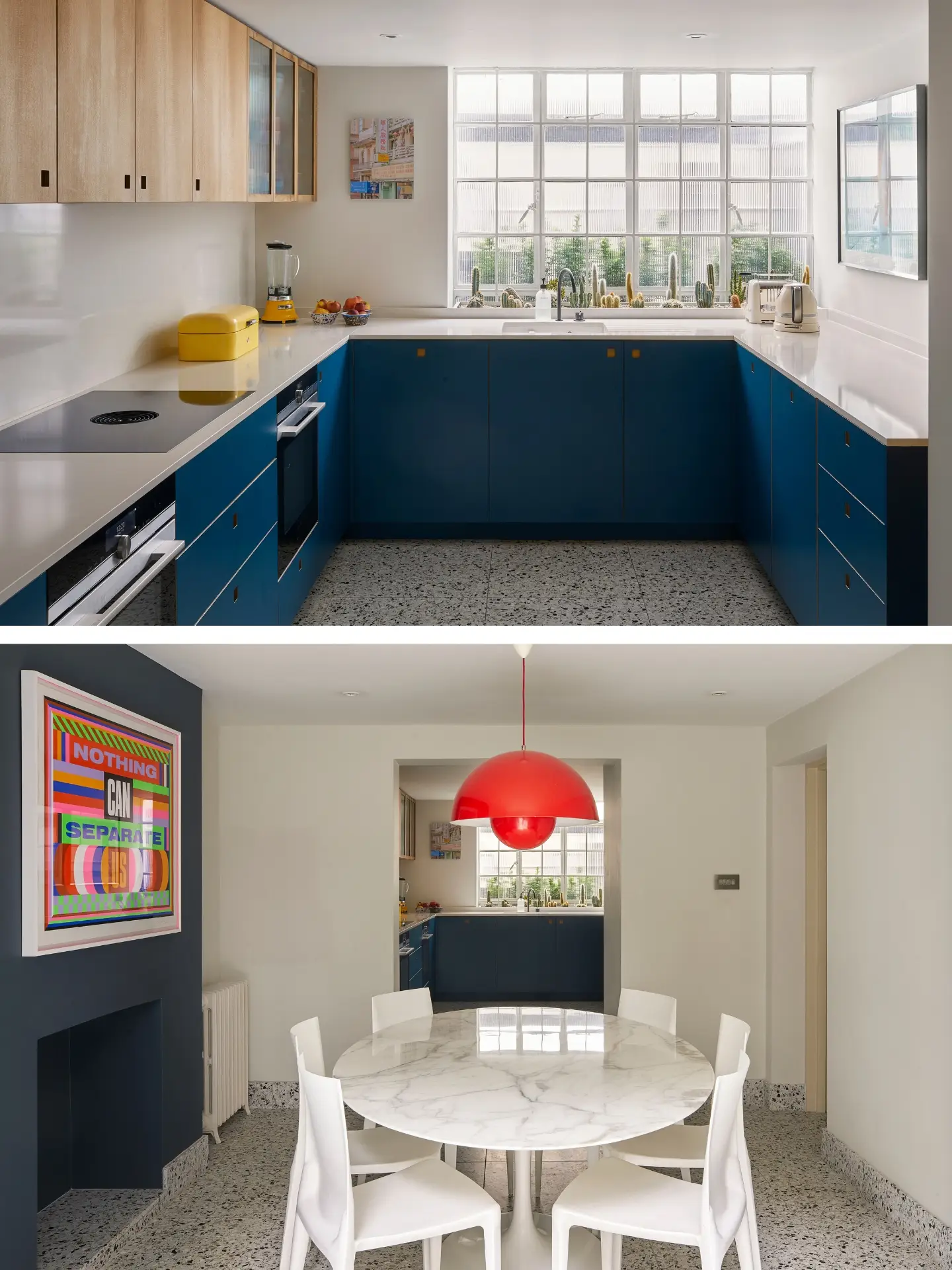 The only tall cupboards are Market Mustard yellow and they are located opposite the window, thus reflecting this bright sunshine hue into the room. The glossy white Silestone quartz worktop and splashback reflect light too, whilst a terrazzo floor runs through the kitchen and dining room to the green courtyard garden uniting these areas together.