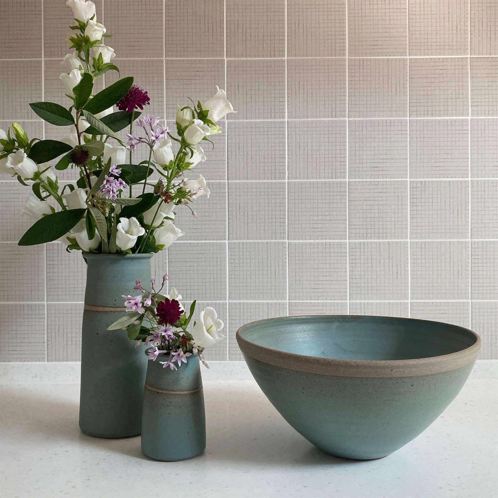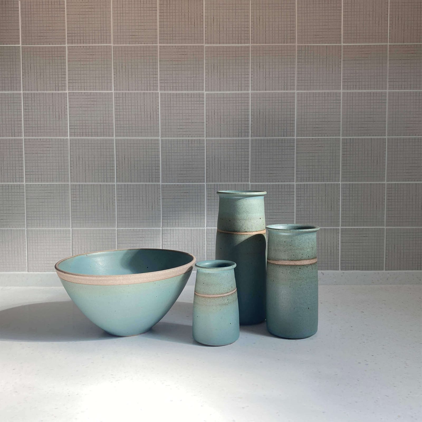 The pieces are simple with a serene and understated beauty. The glazes are composed of basic raw materials and the blue, straw and jade colours have a delicate quality thanks to the gentle speckling and line of unglazed clay.